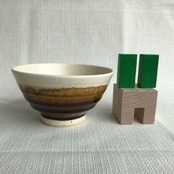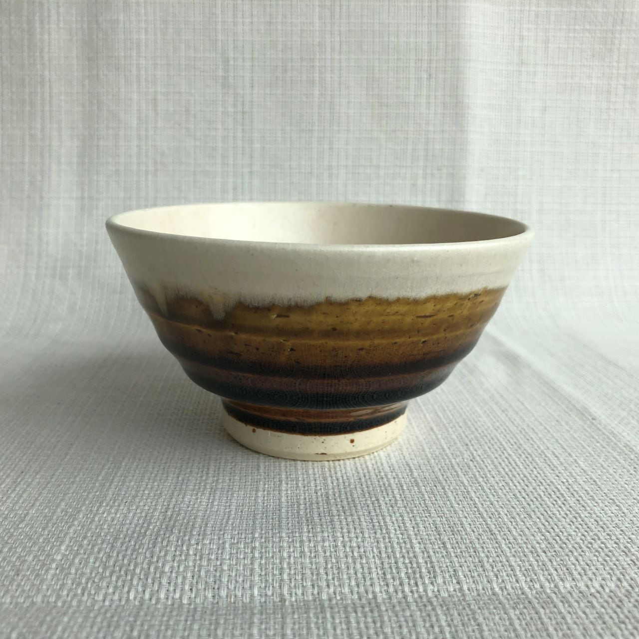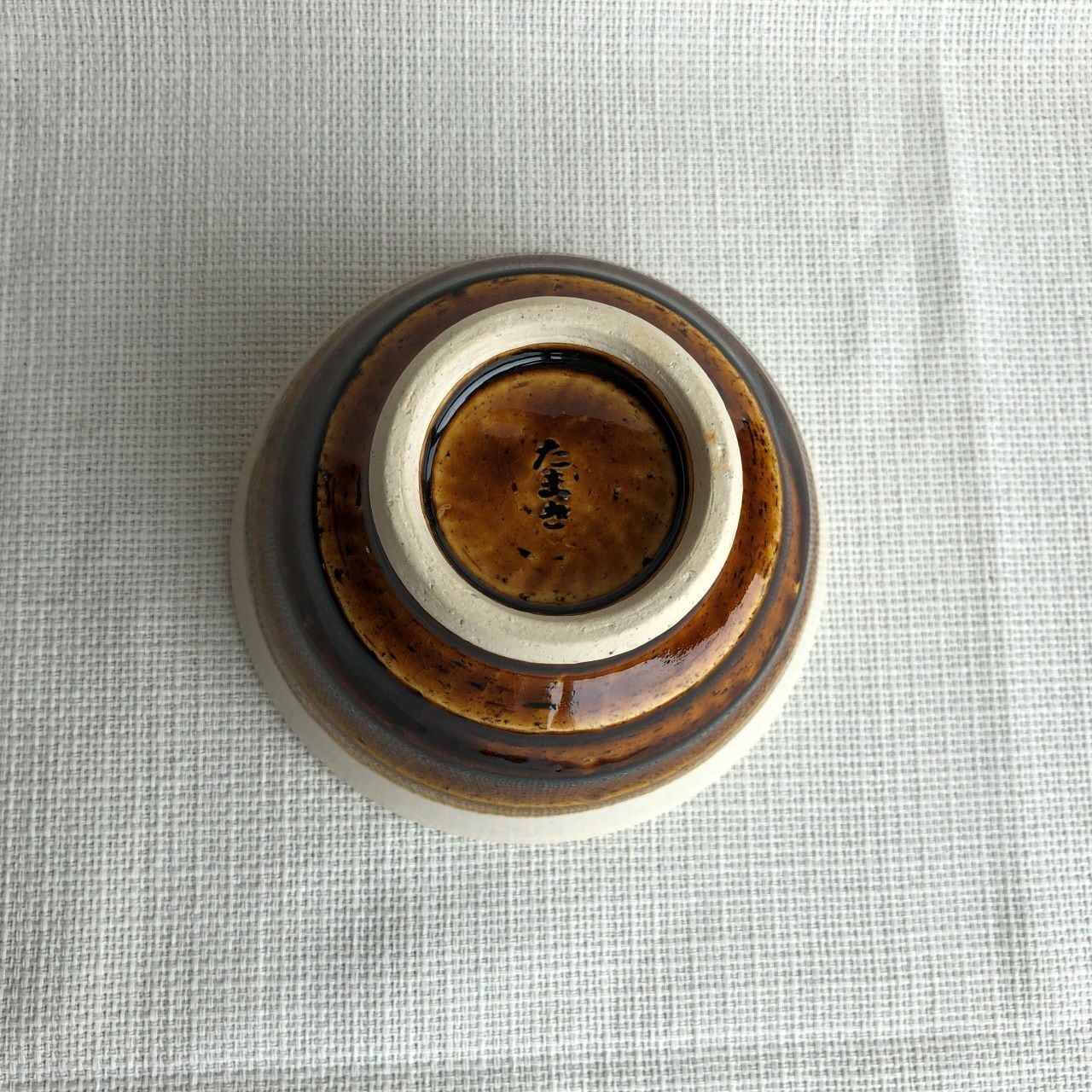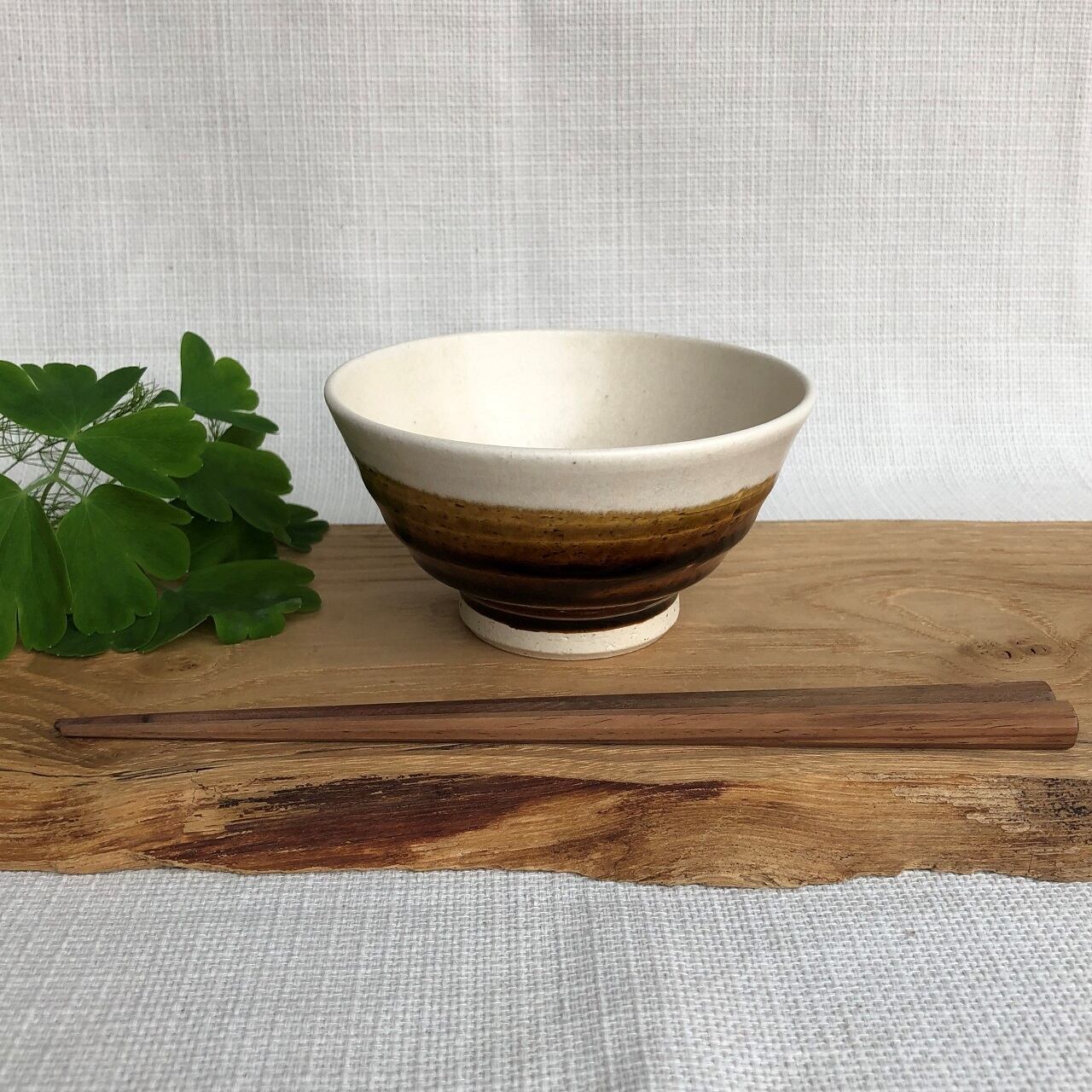 ロクロ成形後 外側にカンナで段をつけていきます。焼き上がると段に溜まった釉薬がほかの場所より若干濃くなり陰影が生まれます。釉薬を掛ける前の下処理を丁寧に行うので、口当たりが柔らかです。また表面の凸凹は滑りにくい効果があります。内側は白い釉薬を掛けてありますので、ごはんのおいしさを邪魔しません。